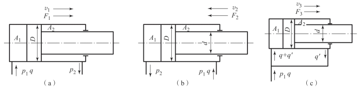 (a)无杆腔进油,有杆腔回油;(b)有杆腔进油,无杆腔回油;(c)差动连接