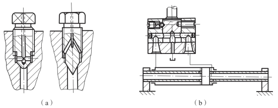 由于液体中混有空气或液压缸停止使用时空气侵入,在液压缸的最高部位常会聚积空气。若不排除就会使缸的运动不平稳,引起爬行和振动,严重时会使液体氧化腐蚀液压元件。排气塞[图3-17(a)]和排气阀都要安装在液压缸的最高部位。对于要求不高的液压缸往往不设专门的排气装置,而是将通油口布置在缸筒两端的最高处,使缸中的空气随油液的流动而排走。如图3-17(b)所示,对于速度稳定性要求高的液压缸和大型液压缸,则需在其最高部位设置排气孔并用管道与排气阀相连排气。