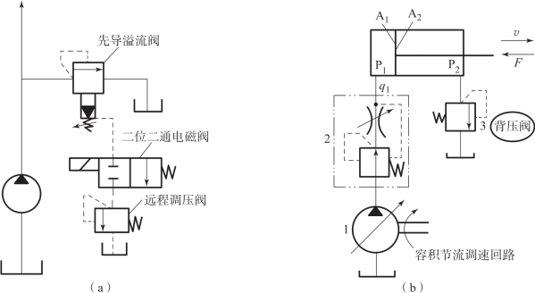 (1)在定量泵供油液压系统中,采用进油节流调速或回油节流调速回路,溢流阀处调定压力下的常开状态,起调压溢流作用,如图5-17(a)所示。