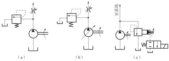 (3)用先导溢流阀和电磁阀组合起使泵卸荷的作用,如图5-17(c)所示。