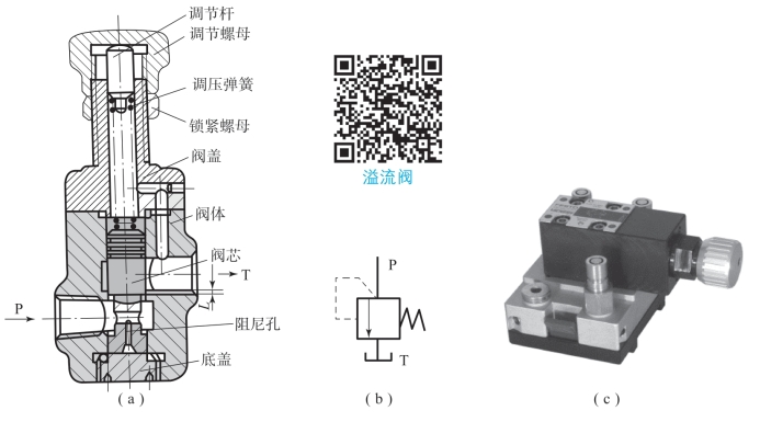 图5-15所示为直动式溢流阀的结构、图形符号及实物图。