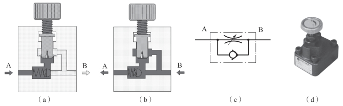 (a)有节流作用;(b)无节流作用;(c)图形符号;(d)实物图
