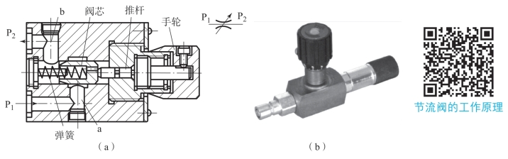 (a)结构简图及图形符号;(b)L形节流阀实物图