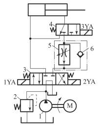 1—液压泵;2—溢流阀;3—换向阀;4—电磁阀;5—调速阀;6—继电控制阀