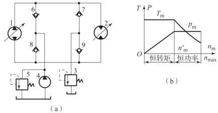 1—变量泵;2—变量马达;3—安全阀;4—补油泵;5—溢流阀;6,7,8,9—单向阀