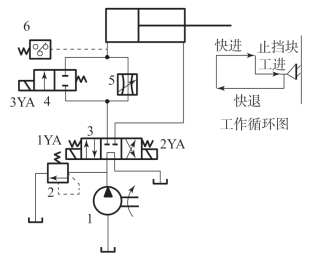 1—变量泵;2,6—溢流阀;3—单向阀;4—换向阀;5—液压缸