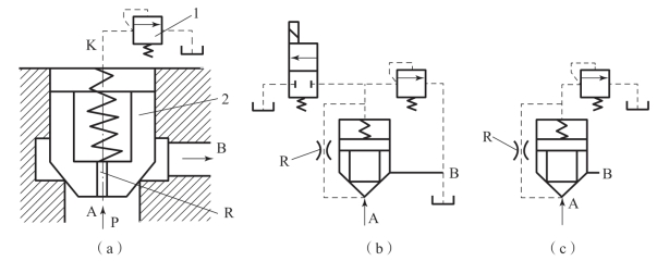 (a)结构图;(b)用作溢流阀或卸荷阀;(c)用作顺序阀