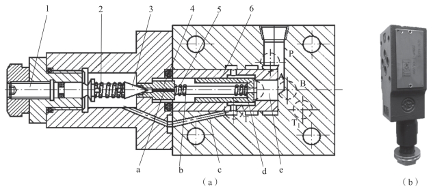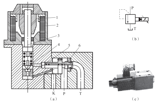 1—比例电磁铁;2—线圈;3—推杆;4—先导阀芯;5—导阀座;6—主阀阀芯
