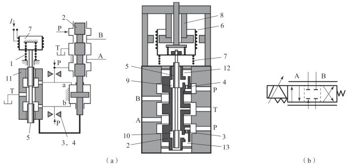 1—弹簧;2—主阀芯;3,4—固定节流孔;5—导阀芯;6—线圈;7—调零弹簧;8—磁钢;9,10—导阀口;11—导阀套;12—主阀驱动腔a;13—主阀驱动腔b