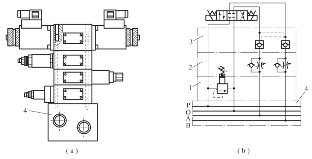 图5-54所示为叠加阀的结构和图形符号。其中叠加阀1为溢流阀,它并联在P与T通道之间,叠加阀2为双向节流阀,两个单向节流阀分别串联在A、B通道上,叠加阀3为双液控单向阀,它们分别串联在A、B通道上,最上面是板式换向阀,最下面还有公共底板。