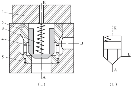 图5-56所示为二通插装阀的结构及图形符号。二通插装阀由控制盖板1、阀套2、弹簧3、阀芯4及插装块体5等五部分组成,其工作原理相当于液控单向阀。改变K口的压力即可改变B口的输出压力。二通插装阀通过不同的盖板和各种先导阀组合,便可构成方向控制阀、压力控制阀和流量控制阀。