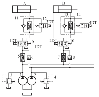 1—高压小流量泵;2—低压大流量泵;3,4—溢流阀;5,7—调速阀;6,8—单向阀;9,10—三位四通电磁换向阀;11,13—单向调速阀;12,14—二位三通电磁换向阀