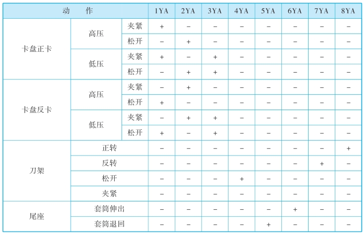 MJ-50型数控车床液压系统原理图如图6-1所示。MJ-50型数控车床液压系统中各电磁阀电磁铁的动作由控制系统的PC控制实现,电磁铁动作顺序如表6-1所示。