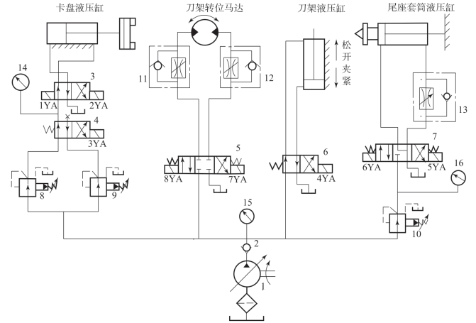 1—液压泵;2—单向阀;3,4,6—二位换向阀;5,7—三位换向阀;8,9,10—减压阀;11,12,13—单向调速阀;14,15,16—压力计