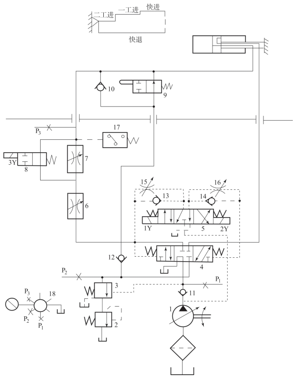 1—限压式变量叶片泵;2—背压阀;3—液控顺序阀;4—换向阀(主阀);5—电磁先导阀;6,7—调速阀;8—电磁阀;9—行程阀;10,11,12,13,14—单向阀;15,16—节流阀;17—压力继电器;18—压力表开关;P1、P2、P3—压力表接点