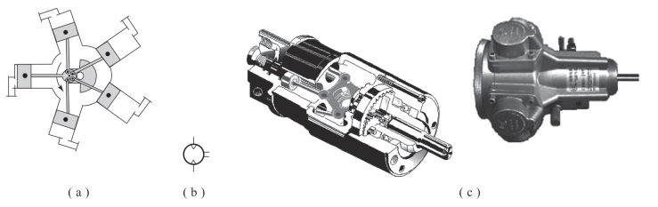 活塞式气动马达结构上还可细分为径向和轴向活塞气动马达,如图7-24所示。压缩空气使活塞和连杆交替运动来驱动马达的曲轴,为保证转动平稳,需要若干个缸。输入压力、活塞数、活塞面积、行程以及活塞速度决定了马达的输出功率。