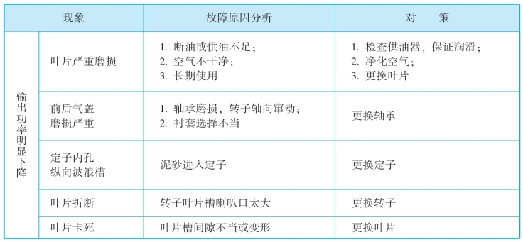 表7-7 叶片式气动马达常见故障分析