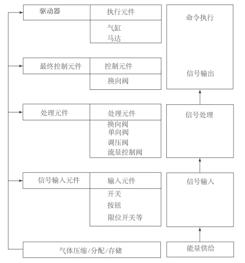 控制链是控制系统的一种分类化表示方法。通过绘制控制链流程图,可以判断出信号的传递方向,以控制信号相应的设备组成分类及关系顺序。如图8-22所示,控制系统可以大致分为信号输入、信号处理、信号输出和命令执行几部分。而在回路图设计中,需要相应的设备依据信号流程设置,显示由信号输入至命令执行的过程路径。如信号输入元件可与气动元件中的开关、按钮、限位开关相对应,以完成相应的信号输入过程;信号处理可由处理元件中的换向阀、单向阀、调压阀、流量控制阀等气动元件完成;信号输出由换向阀这一气动元件完成最终控制;命令执行由执行元件的气缸、马达等气动元件完成回路图的最终功能要求。