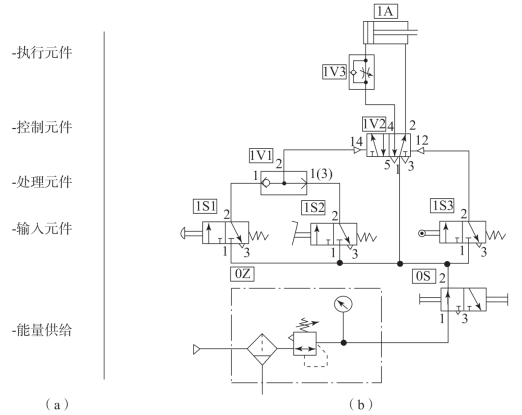 (1)输入元件是手动驱动阀1S1、1S2(脚踏控制阀)以及机械驱动阀1S3(滚轮杠杆阀)。