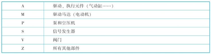 这种标示方式主要用于系统化地设计气路图。限位开关用在气缸上,可以反映活塞杆所在位置。气缸伸出行程的最远端气动回路图的元件应按照《液压与气动图形符号》(GB786—2021)进行绘制。为了便于气动回路的设计和对气动回路进行分析,可按DINISO1219-2标准的规定对气动回路中的各元件进行编号,在编号时不同类型的元件所用的代表字母也应遵循以下规则:泵和空压机—P;驱动、执行元件—A;电动机—M;信号发生器—S;阀门—V;其他元件—Z(或用上面提到的其他字母),如表8-4所示。