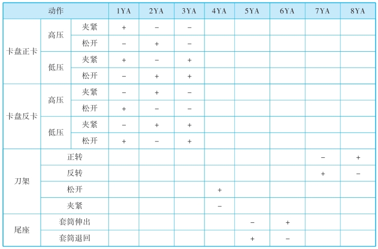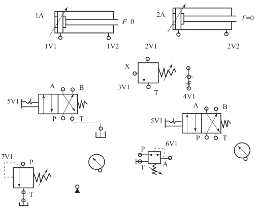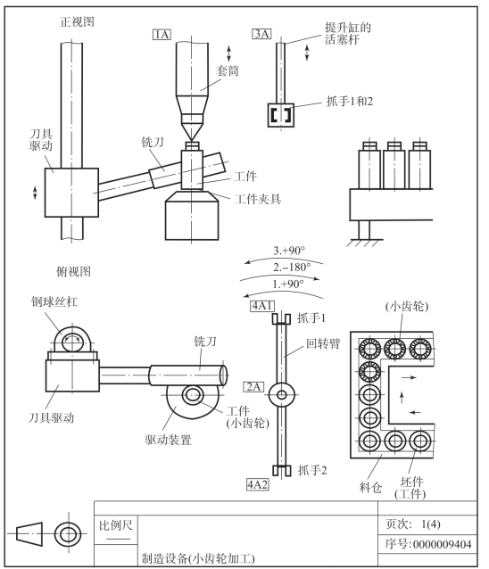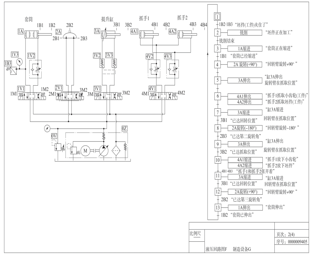题图9-1所示为小齿轮生产线流程简图,其工作流程为:工作时,将已预车削的毛坯件(工件)通过套筒压入带端面的驱动顶尖的固定套中,达到夹紧压力后工件和铣刀旋转起来。铣削开始,加工一个小齿轮。铣刀经钢球丝杠产生进给运动,铣完后套筒退回,回转臂旋转+90°,然后向下走。抓手1抓铣好的小齿轮,抓手2抓起料包中的一个坯件。然后回转臂向上走,旋转-180°,再次向下走。回转臂通过这一系列动作将小齿轮送入料包,将坯件送入固定套。两个抓手打开,回转臂向上走,接着旋转+90°,退回到中间位置。套筒夹住新坯件,铣削过程从头开始。其回路图如题图9-2所示。