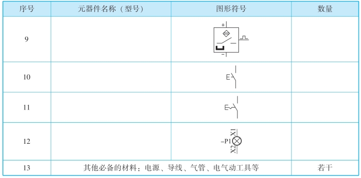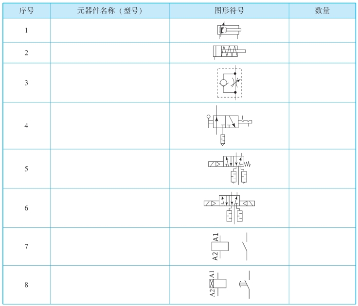 (1)回路信息分析:小组讨论,列出气压回路所用的器材名称、图形符号。