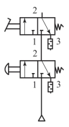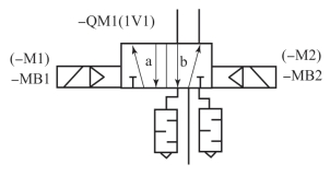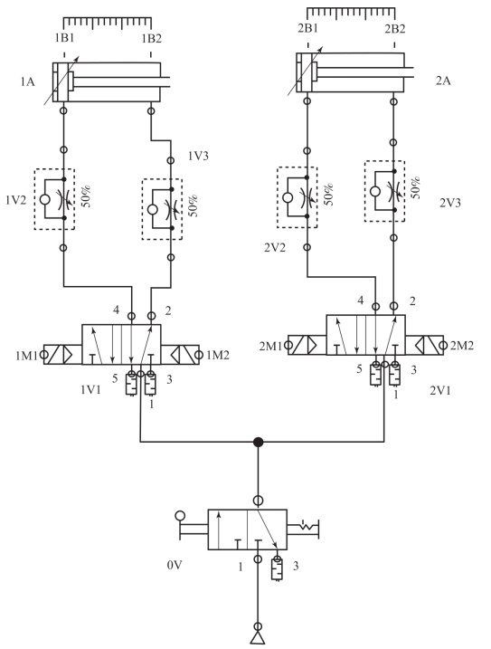 (1)二位三通换向阀0V打开时,整个气路系统才会有气流通过。气流经过二位三通换向阀进入两个双侧电二位五通换向阀。