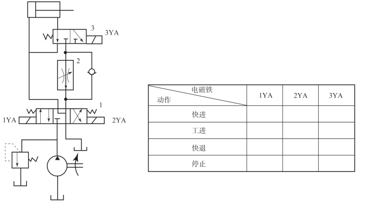 (5)依据题图1-3所示液压系统原理图,将液压传动系统图形符号按液压系统组成填入表格。