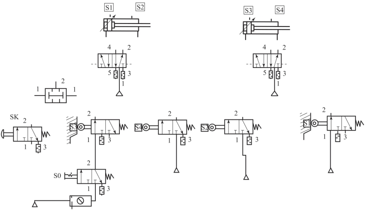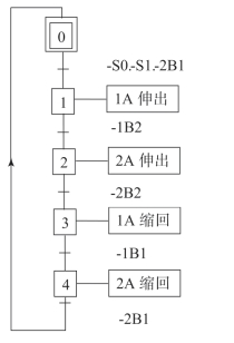 分析该推料机械的功能图,将整个控制流程细分为4个步骤:步骤一:主开关S1置于EIN(接通)位置,主开关S3置于EIN(接通)位置,按压SK气缸1A伸出;步骤二:限位开关S2被气缸1A触发,气缸2A伸出;步骤三:限位开关S4被气缸2A触发,气缸1A缩回;步骤四:限位开关S1被气缸1A触发;气缸2A缩回,限位S3被2A缸触发完成一个循环。