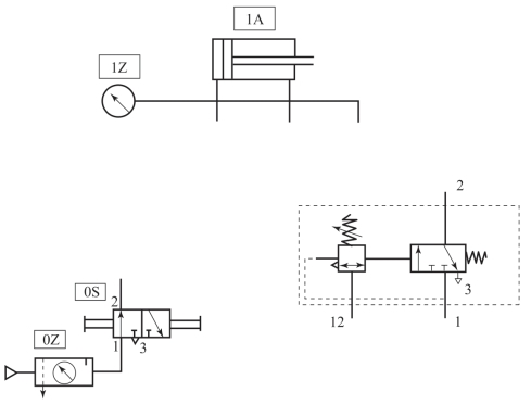 (1)当按钮S0闭合、按钮( )闭合、接近开关2B1处于触发位置时,气缸1A实现( )动作。