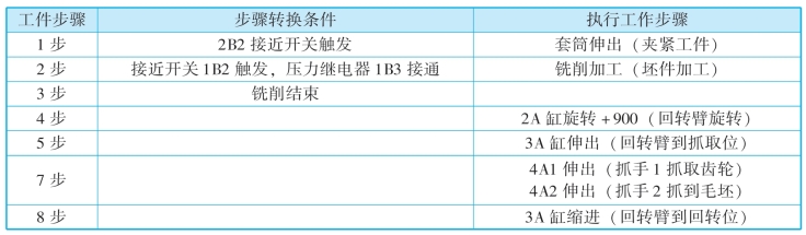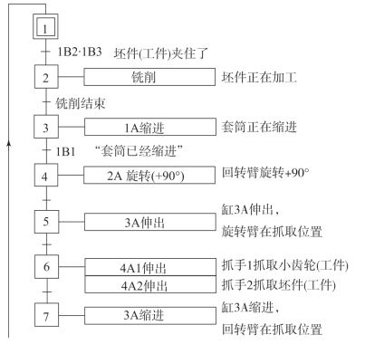 功能图将整个控制流程细分为13个步骤,在步骤旁边的控制符号内列出需执行的指令。在各步骤之间的转变处列出下一步控制的必要条件。例如:第2步的工作是铣削齿轮毛坯,该步骤开始的条件是:套筒伸出,夹紧工件,触发接近开关1B2;同时夹紧压力达到要求,触发压力继电器1B3接通。