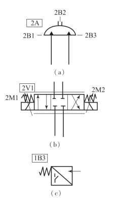 (2)当接近开关2B1处于触发位置时,2B1( )、中间继电器( )的线圈得电,它的NO触点得电闭合。如果此时K2的NO触点得电闭合,电磁阀( )的线圈得电。
