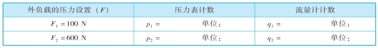 将外负载的压力F分别设置为F=200N,F=600N,F=1000N时,完成引导问题中相应压力表及流量计显示的信息记录,并进行分析。