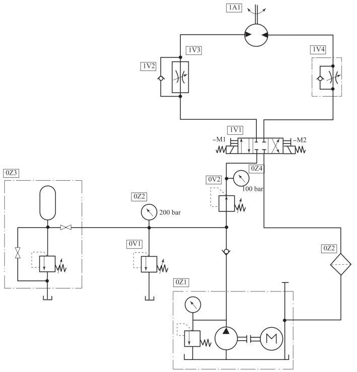 1.如题图9-7所示轧辊驱动装置液压系统原理图,实现薄膜经轧辊机座压制到要求的厚度,然后卷绕到卷盘上。请完成以下对液压原理图的分析:(1)轧辊的旋转驱动由哪个液压元件完成?(2)0V2是什么阀,在回路中起什么作用?(3)过滤器属于哪种安装位置?1V1处中位时,液压泵能实现卸荷吗?
