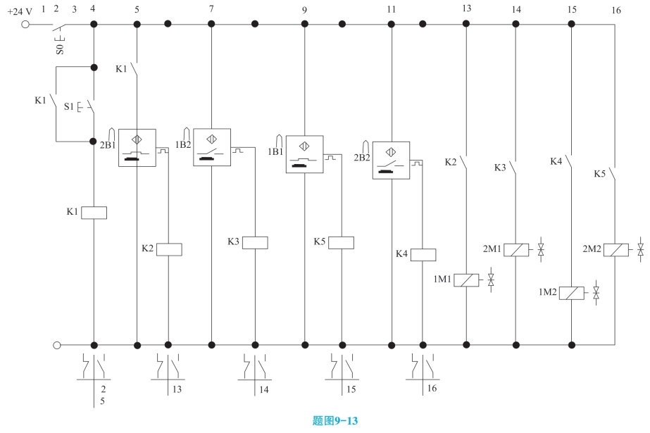 5.请针对纯气控的换向回路,改造成双侧电控制,分析以下相应的电气控制原理图,如题图9-13所示。