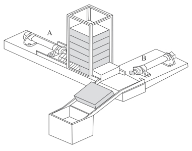 工业应用装置中的送料机构:用A、B两个气缸将工件从料仓中传递到滑槽。按下按钮,气缸A伸出,将工件从料仓推出,等待气缸B将其推入输送滑槽。工件传递到位后,A缸缩回,接着B缸缩回。