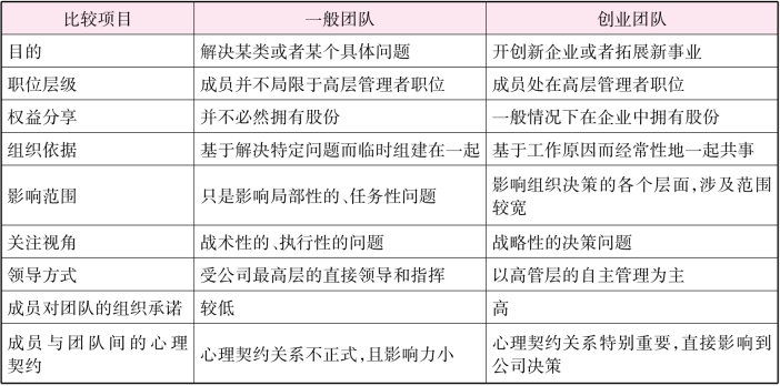 如果将创业团队和一般团队做比较,就会发现有诸多不同之处(表11-1)。