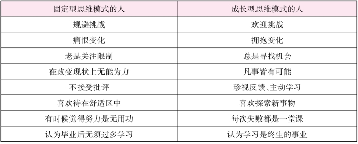 固定型思维模式的人与成长型思维模式的人的区别可归纳为表2-1。