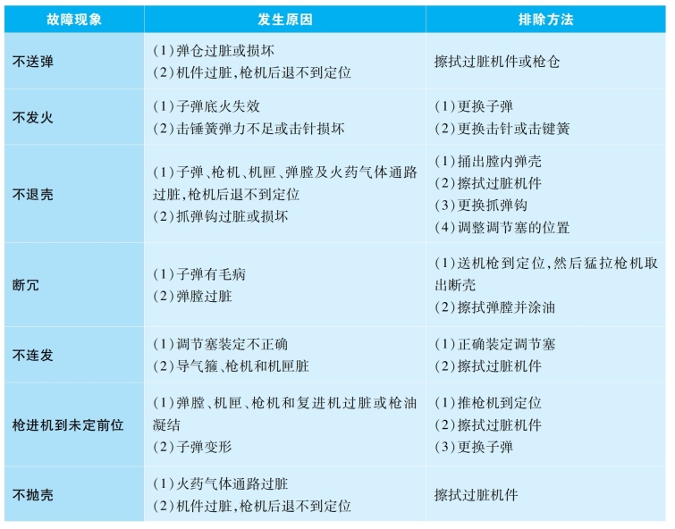 射击中,若发生故障,通常拉枪机向后,重新装弹继续射击。如果仍然有故障,应迅速查明原因并予以排除。如果排除不了,应迅速向指挥员报告。半自动步枪可能发生的故障、原因及排除方法,见表7-1。