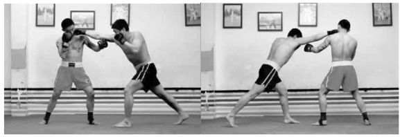 由基本姿势以右脚掌蹬地开始发力,右腿发出的力量使右侧髋关节前送,带动腰部迅速向前转动,同时右肩前送,能够增加右直拳的力量和攻击距离。