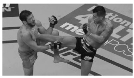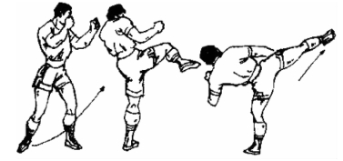 动作说明:左脚上前一步,右腿屈膝提起,脚面绷直,大腿带动小腿,用脚面猛力前弹踢出,可伤及敌心窝、腹部、裆部及下颌。
