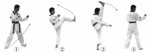 动作说明:进攻时上右脚,同时身体左转。保持左转势能,再以右脚掌为轴,身体迅速向左后转180°,带动左腿用脚跟扫击向对方中盘或头部;可伤及敌头部、胸腹部或肋部。