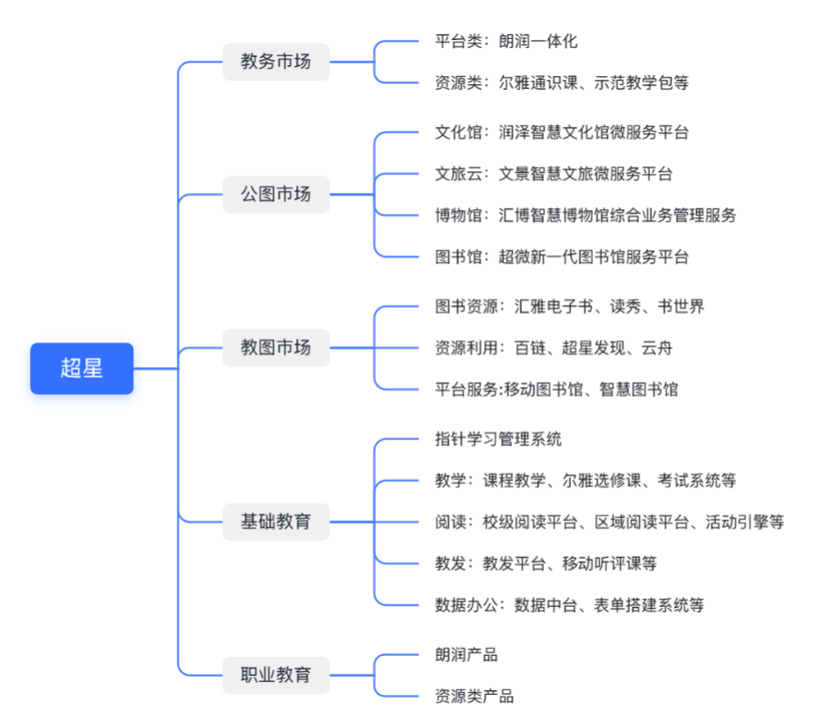 在企业定位上,超星是一家高度专注和垂直的企业,只做两件事,一是数字图书馆,二是数字教育。在这两大领域下,超星的业务范围主要涉及五大市场:高校图书馆、高校教务处、职业教育、公共文化和基础教育。入职不同市场的同事需要学习不同的产品和项目知识。各大市场的主要产品如下: