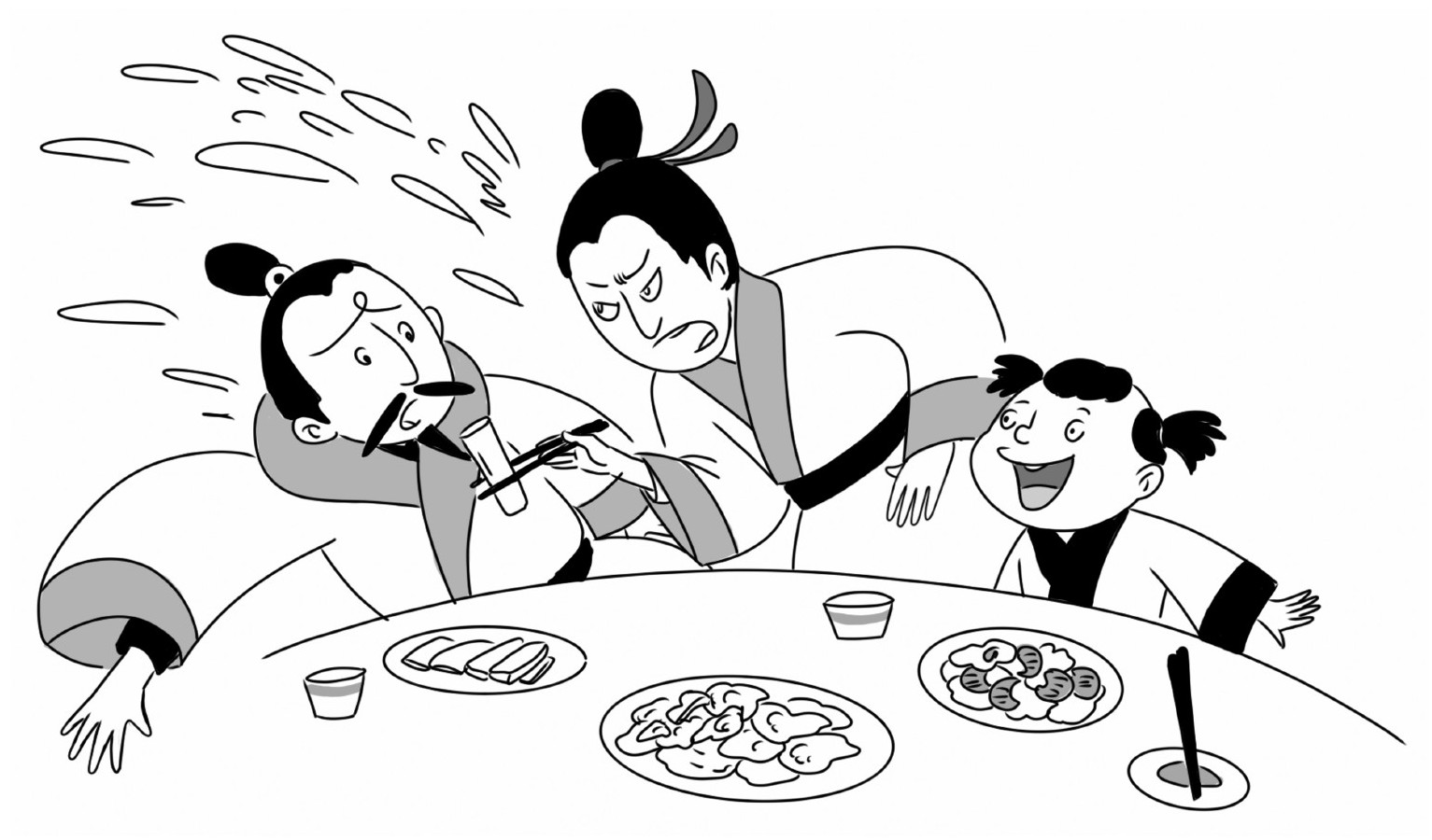 一个秀才给人家做私塾先生。主人每顿饭只有萝卜一个菜。先生心里很不痛快。一天,主人请先生一起吃饭,顺便看看儿子学得怎样。老师先对学生说:“你爸爸吃饭时,如果要对对子,你看我的筷子夹住什么,你就对什么。”学生答应了。一会儿,主人来了,请先生上坐,儿子在旁边陪着。主人说:“先生每天费心思教,想来我儿子应该学到不少东西了。”先生说:“对对子还可以。”主人说:“我出两字对,核桃。”学生看着先生。先生拿筷子夹萝卜,学生说:“萝卜。”主人说:“不太好。”又说:“绸缎。”先生又用筷子夹萝卜。学生说:“萝卜。”主人说:“绸缎如何对萝卜?”先生说:“萝是丝罗之罗,卜是布匹之布,有何不可?”主人抬头,看到隔壁东王庙,说:“鼓钟。”先生又用筷子夹萝卜,学生又对“萝卜”。主人说:“这更对不上了。”先生说:“萝乃锣鼓之锣,卜乃铙钹之钹,有何不可?”主人说:“太勉强了。”又出二字对:“岳飞。”先生又夹萝卜,学生仍对“萝卜”。主人说:“这更加不对了。”先生说:“岳飞是忠臣,萝布乃孝子,有何不可?”主人便发怒了:“先生怎么总是让我儿子对萝卜?”先生也发火说:“你天天叫我吃萝卜,好容易请客,也叫我吃萝卜。我眼睛看的也是萝卜,肚内装的也是萝卜,你让我怎么不教你儿子对萝卜?”