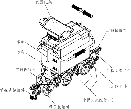 当手推车从轨道上抬下时,仅需将前后翻板翻起即可,而不需将车体下部的探头架升起。只有当手推车在轨道上推行并不探伤时,为了减少探头磨耗,才需将车体下部的3只探头架升起。