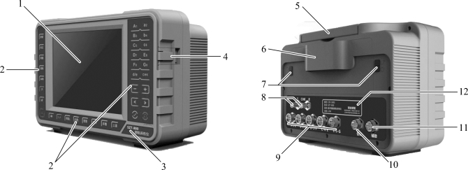 1—显示屏;2—按键;3—型号牌;4—USB门;5—提手;6—锂电池;7—电池锁扣; 8—校对通道接口(Q9);9—组合探头接口(GX16-7芯);10—位移轮接口(GX16-5芯); 11—辅助接口(GX16-4芯);12—铭牌。