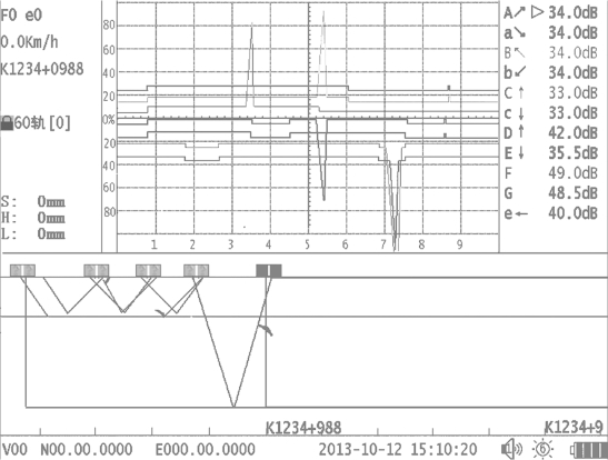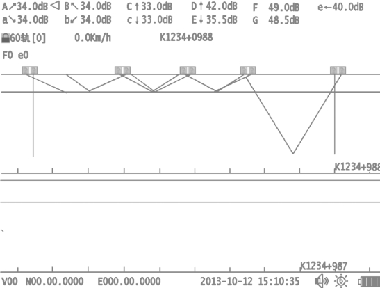 ④ B超区域:位于屏幕下部。各通道B超的颜色、增益显示的颜色和A超波形的颜色相同。B显区域的下方为里程标尺,标尺每一格为20 cm。