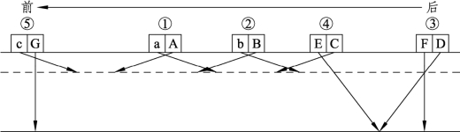 SZT-800和SZT-800S最多可用10个双晶片探头同时探伤,10个探头组成5个组合探头,探头在小车上的分布位置如图1-0-8所示。其中,Aa组合为1号探头,Bb为2号探头,DF为3号探头,CE为4号探头,cG为5号探头。