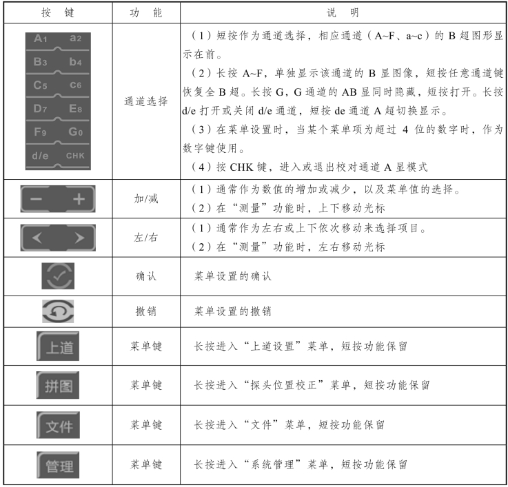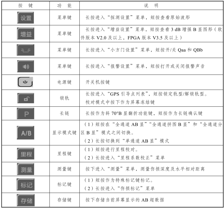 SZT-800数字式钢轨探伤仪常用按键说明见表1-0-2。