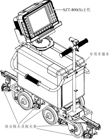 SZT-800数字式钢轨探伤仪由SZT-800主机、组合探头及探头架和专用手推车组成(见图1-0-1)。SZT-800主机主要由显示屏、按键、提手、控制通道等部分组成(见图1-0-2)。